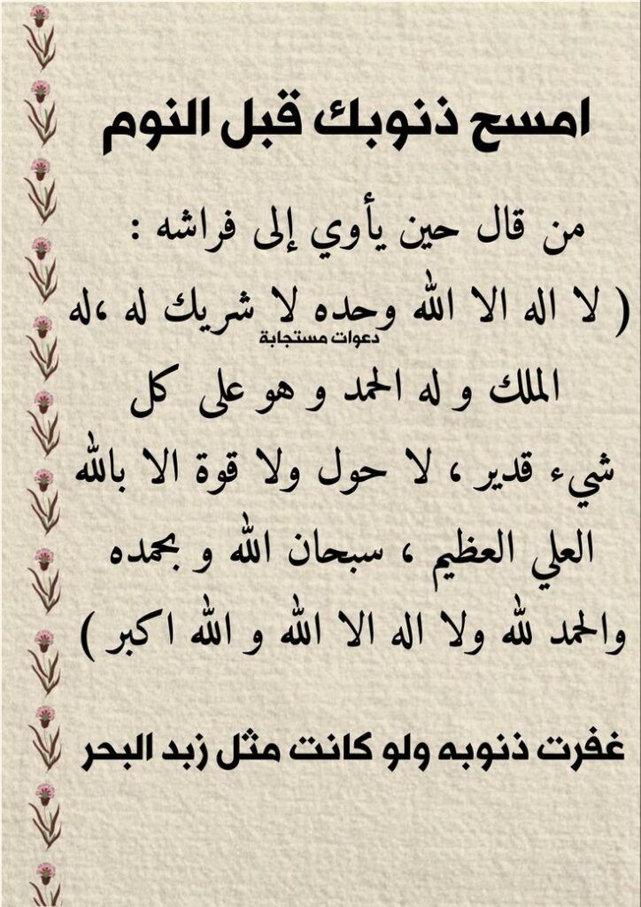 • ” اللهم لا إله إلا أنت، رحمتك أرجو، فلا تكلنى إلى نفسى طرفة عين، وأصلح لي شأني كله، شأن الدنيا والآخرة، في عفو منك وعافية، لا إله إلا أنت”.