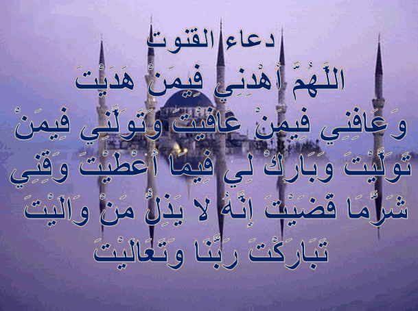 - اللهم اهدنا فيمن هديت، وعافنا فيمن عافيت، وتولنا فيمن توليت، وبارك لنا فيما أعطيت، وقنا شر ما قضيت، إنك تقضي ولا يقضى عليك، إنه لا يذل من واليت، ولا يعز من عاديت، تباركت ربنا وتعاليت، لك الحمد على ما قضيت، ولك الشكر على ما أعطيت.