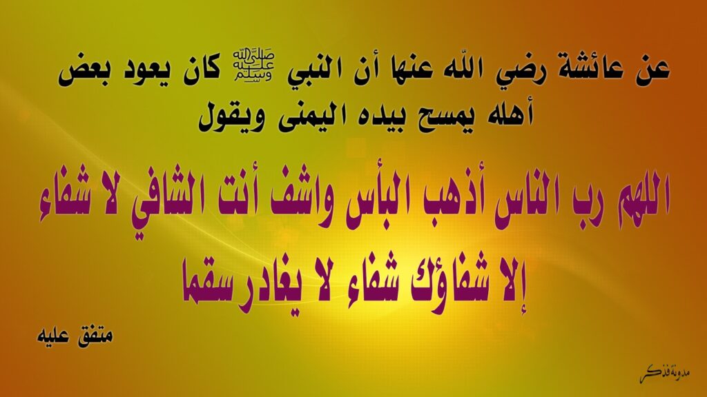 - “اللهم رب الناس، مذهب الباس، اشف أنت الشافي، لا شفاء إلا شفاءك، شفاءً لا يغادر سقما.
