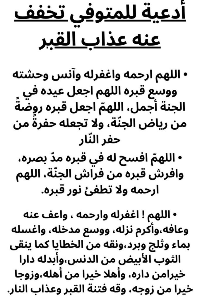 - اللهم اغفر له وارفع درجته في المهديين، واخلفه في عقبه في الغابرين، واغفر لنا وله يا رب العالمين، وافسح له في قبره ونور له فيه.